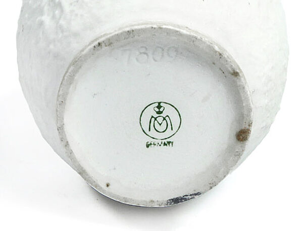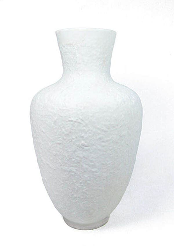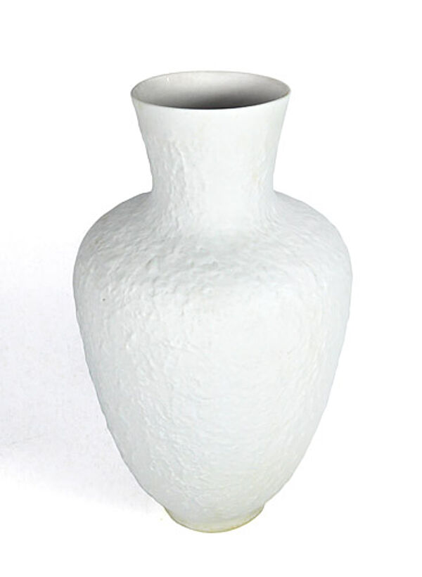 Der Korpus aus weißem Porzellan weist betonte Schultern, eine leichte Verjüngung zum Stand und einen ausgezogenem Halsbereich auf. Die Oberfläche wirkt unregelmäßig strukturiert und ist unglasiert . Höhe ca. 22,5 cm, geringe Gebrauchsspuren, so zeigen sich leichte Verunreinigungen. Unterseitig Markung sowie blind geprägte Form-Nummer "1809". Wohl 1960er, 70er Jahre.