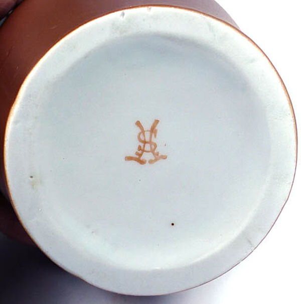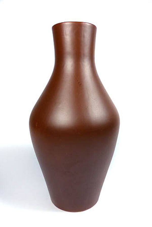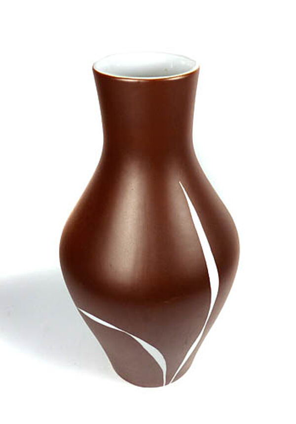 Mittig gebauchter Porzellankorpus mit langgestrecktem Halsbereich. Außenseitig braun glasiert, vorderseitig zeigen zeigen sich zwei fingerförmige, stilisierte, weiße Blätter. Höhe ca. 23 cm, professionell restauriertierter Chip (nicht mehr sichtbar), ansonsten nur geringe Gebrauchsspuren. Unterseitig ungedeutete Markung, wohl Deutschland der 1960er Jahre.