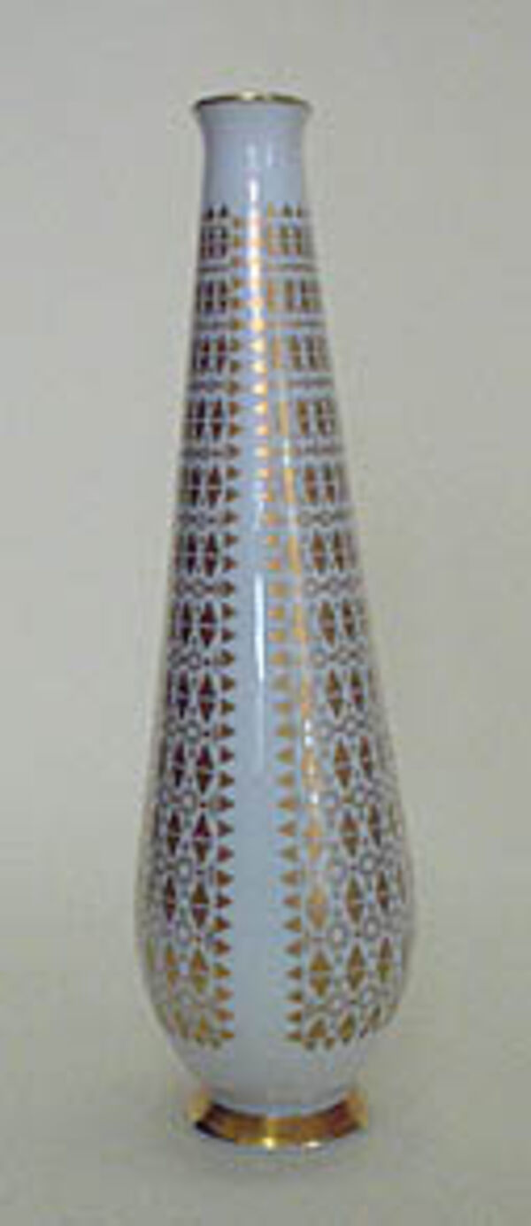 Langgestreckter, oberhalb des ovalen Standes moderat gebauchter, sich zur leicht ausgestellten Mündung allmählich verjüngender Porzellankorpus. Geometrisches Golddekor aus Dreiecken, Punkten und Kreisen. Vergoldeter Rand und Fuß. Höhe 24 cm, geringe Altersspuren. Unterseitig gemarkt Hutschenreuther sowie bezeichnet "Form - Prof. Lili Schultz, Dekor - Lorenz Hutschenreuther". Wohl 1960er Jahre.