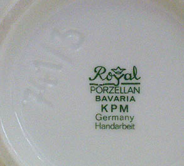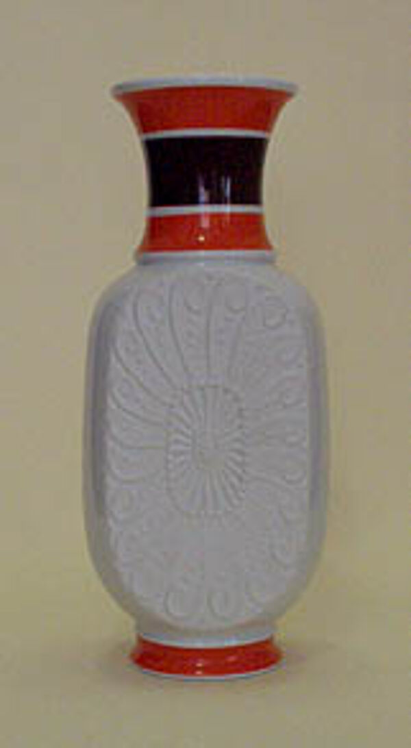 runder Stand, ovaler, abgeflachter Korpus, ausgestellte Mündung, unglasiertes Reliefdekor, orange u. braune Bänder, H. 28,5cm, gestempelt Royal Porzellan Bavaria, Modellnr. 741/3, Handarbeit, 1960er/70er