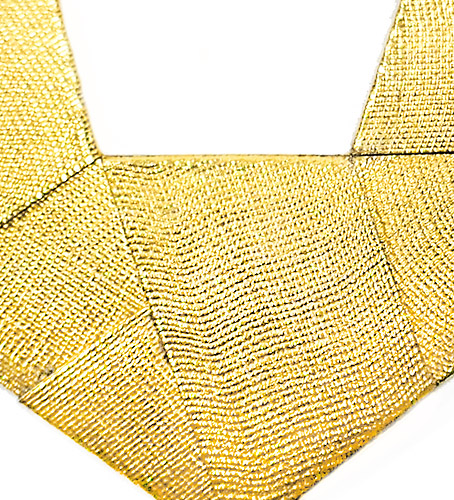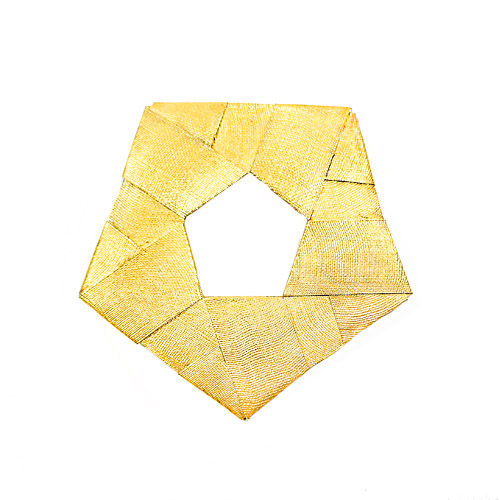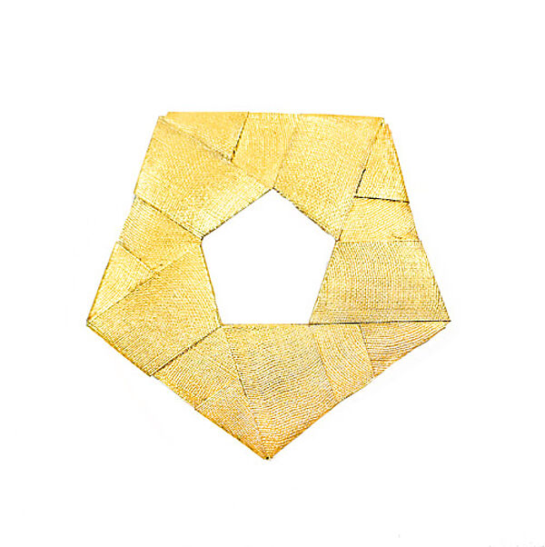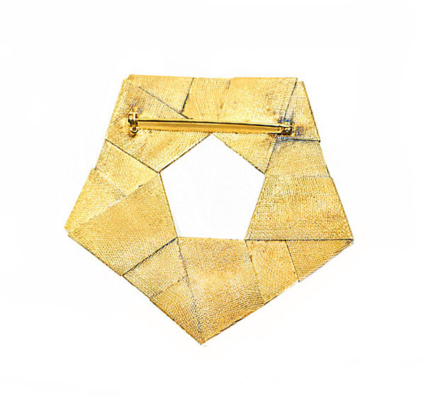 Flacher, 5-eckiger, mittig offen gearbeiteter, vergoldeter Silberkorpus, dessen Oberfäche die Anmutung eines gewickelten, grob gewebten Stoffbandes aufweist. Maße ca. 6,2 cm, geringe Alters- bzw. Tragespuren. Rückseitig signiert "Loeber" und bezeichnet "Sterling 24 K"(arat) sowie Sicherheitsbroschierung mit flachem Kopf. Evtl. 1970er, 80er Jahre?