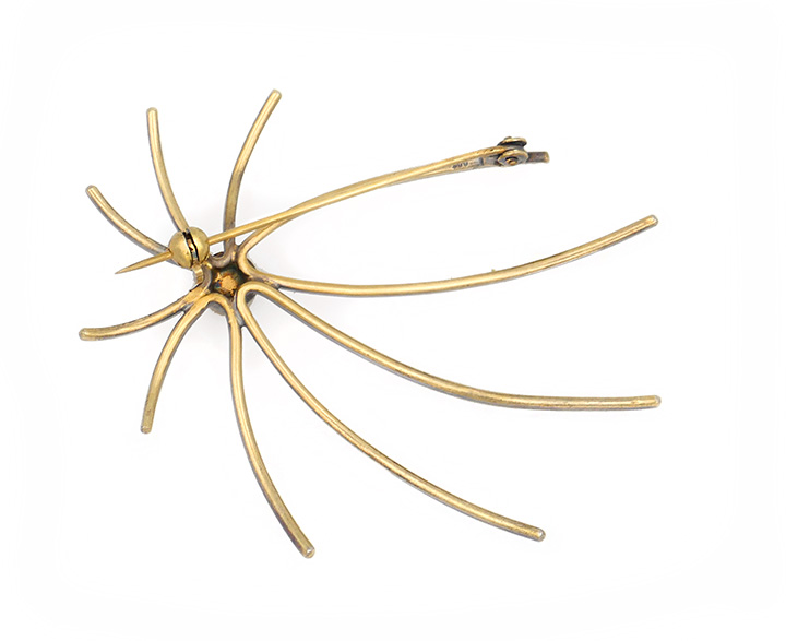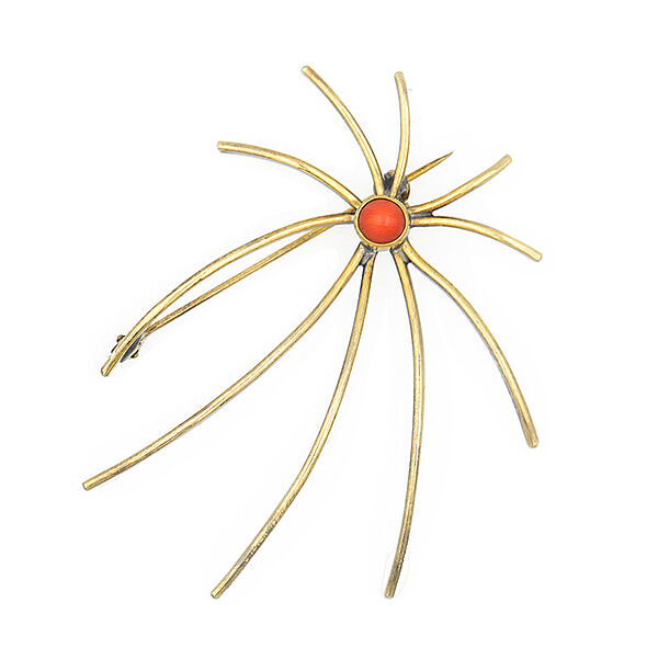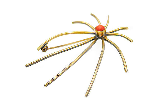 Vergoldeter Silberkorpus (900er), der mittig einen kleinen Korallen-Cabochon in Zargenfassung trägt. Hiervon gehen in unterschiedlicher Länge leicht konvex gebogene, zarte Tentakel aus. Maße ca. 6,5 x 4,5 cm, geringe Tragespuren. Rückseitig Sicherheitsverschluss mit Kugelkopf. Ungemarkt, wohl 1940er bis 60er Jahre.