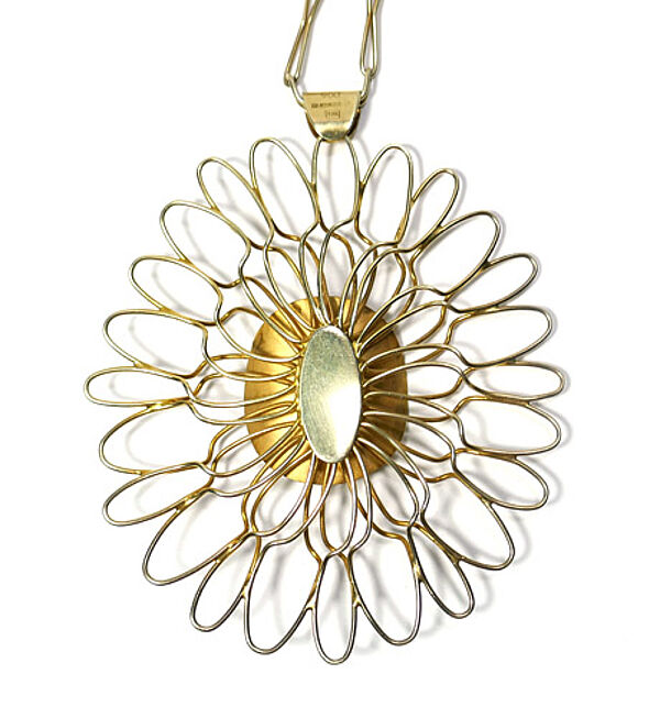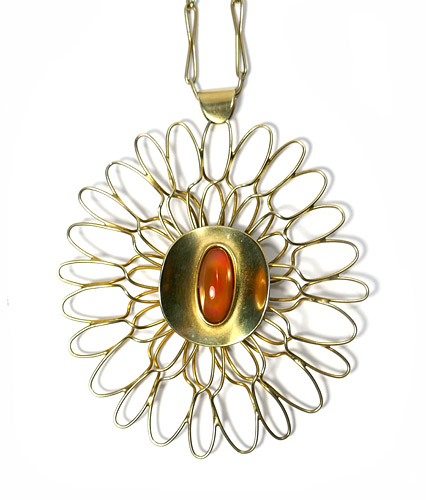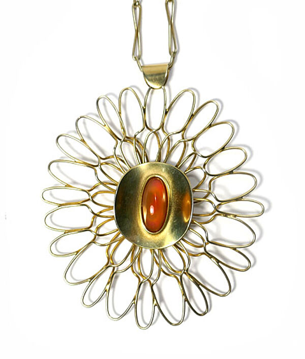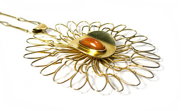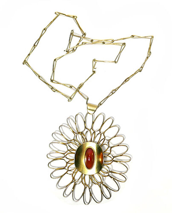 Das handgearbeitete Collier wird durch einen relativ großen Anhänger in stilisierter Blütenform aus zartem, vergoldeten Silberdraht (900er) dominiert, der zentral ein schalenförmiges Element integriert, welches ein ovales Karneol-Cabochon in Zargenfassung trägt. Oberseitig bewegliche, laschenförmige Anhängeröse, durch die eine zarte, ebenfalls vergoldete Ankerkette mit langgestreckten, mittig, leicht gestauchten Gliedern und einfachem Hakenverschluss gezogen ist. Maße des Anhängers ca. 8 x 7 cm, Cabochon ca. 2 x 0,8 cm, Kettenlänge ca. 58 cm, geringe Altersspuren. Rückseitig an der Öse Markung sowie Bezeichnung "HANDARBEIT". Wohl 1960er, 70er Jahre.
