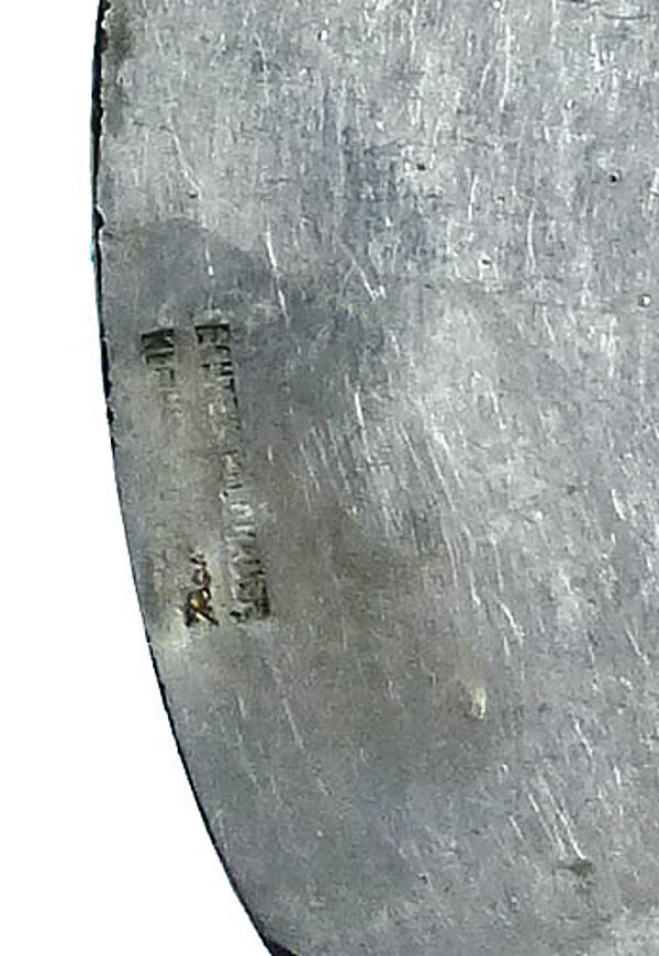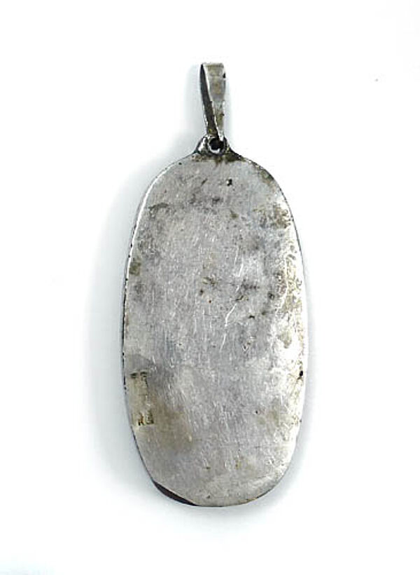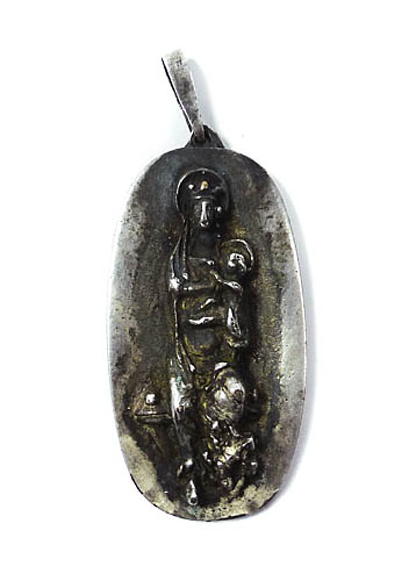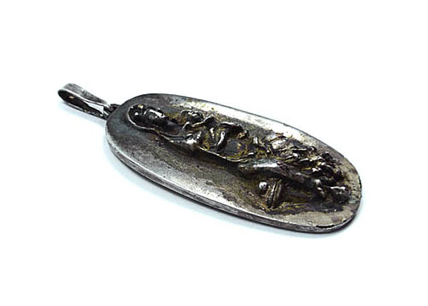 Hochovaler versilberter Bronzekorpus, vorderseitig expressiv-abstrahiertes, relativ hohes Relief einer stehenden Madonna mit Kind. Oberseitig längliche, bewegliche Anhänger-Öse. Rückseitig Bezeichnung "ECHTES BILDHAUERKLEINKUNSTWERK". Maße ca. 5,8 x 2,8 cm, Länge mit Öse ca. 7 cm, ungeputzter Zustand mit dunkler Patina und geringen Tragespuren. Wohl Deutschland der 1960er Jahre.