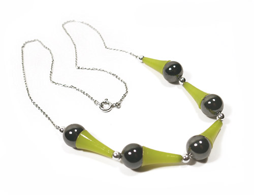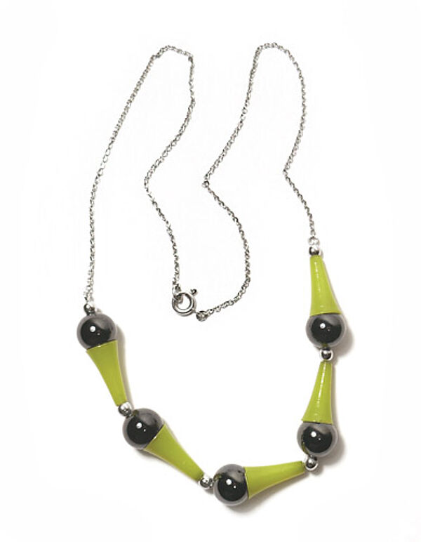 Zarte, silberne oder versilberte Ankerkette mit Ringösenverschluss. Mittig sind 5 Elemente integriert, die jeweils aus einer schwarz gefassten Metallkugel bestehen, der seitlich ein schlanker, gelber Kunststoff-Kegel "aufgesetzt" ist. Getrennt werden diese Elemente dur kleine versilberte Kugeln. Länge ca. 44 cm, geringe Altersspuren. Ungemarkt, wohl 1940er bis 60er Jahre.