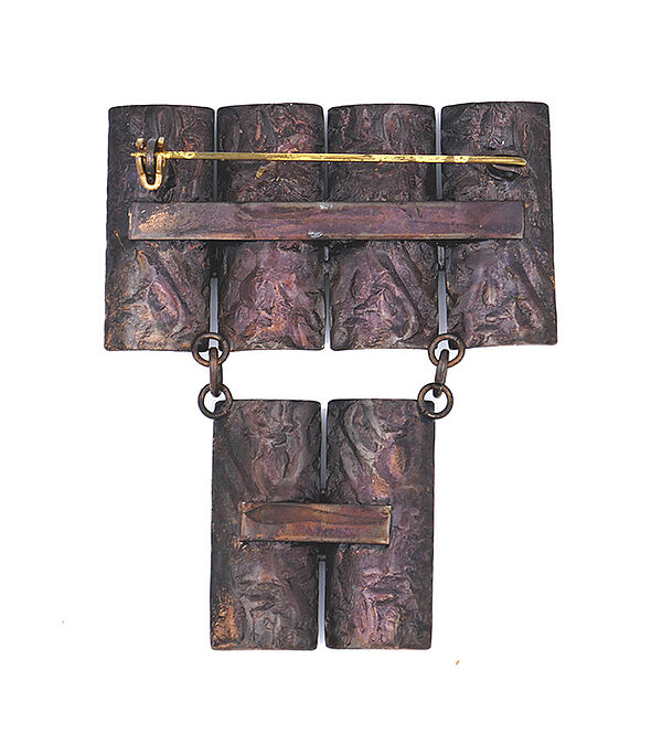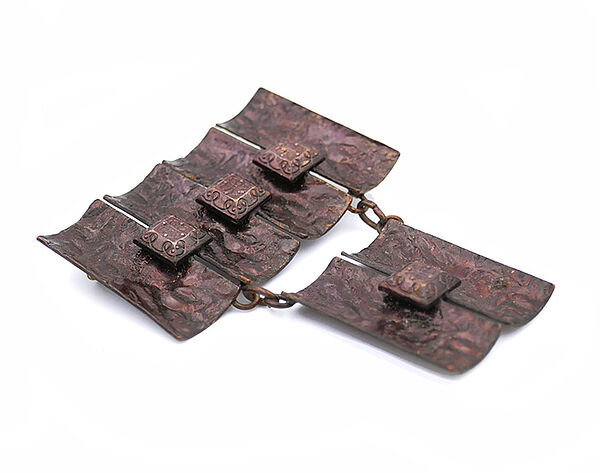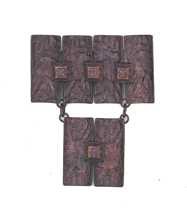 Der Korpus besteht aus 4 starr in einer Reihe angeordneten, hochrechteckigen, konkav gemuldeten, unruhig reliefierten und dunkel patinierten kleinen Kupferplatten sowie einem mit zwei kurzen Ankerketten abgehängten Paar weiterer Kupferplatten gleicher Ausführung. Zwischen den Platten ist jeweils mittig ein kleines quadratisches Element aufgesetzt, welches ein geprägtes Dekor einer stilisierten Blüte trägt. Maße ca. 6,3 x 5 cm, geringe Alters- bzw. Tragespuren. Rückseitig Sicherheitsbroschierung mit Kugelkopf aus Messing. Unbezeichnet, wohl 1960er Jahre.