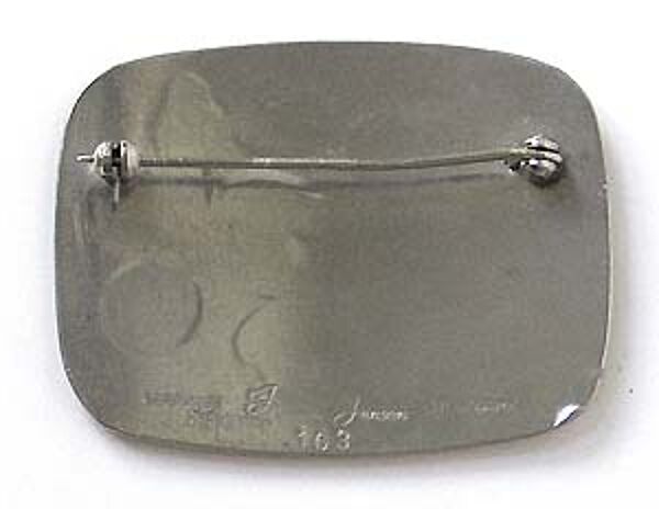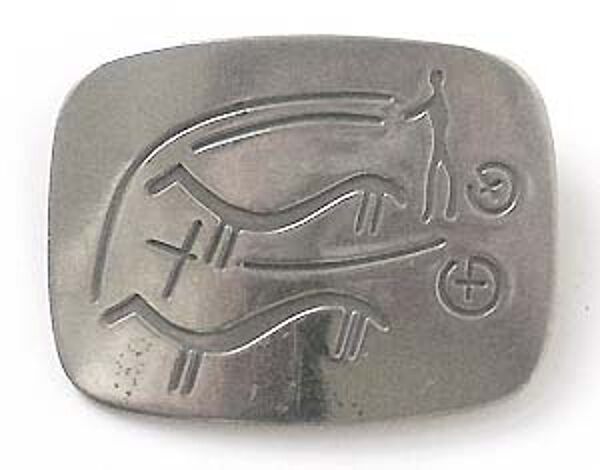 Der annähernd rechteckige Zinnkorpus hat abgerundete Ecken. Vorderseitig geprägte Darstellung eines stark stilisierten Mannes und zweier Pferde bzw. eines Pferdewagens, die an eine prähistorische Höhlenzeichnung erinnert. Rückseitig Sicherheitsbroschierung mit Kugelkopf. Maße ca. 5,1 x 3,8 cm, diskrete Gebrauchsspuren. Rückseitig Markung sowie diverse Bezeichnungen: "HANDMADE", "PEWTER" (Zinn) sowie "163". Wohl 1950er oder Anfang 1960er Jahre.