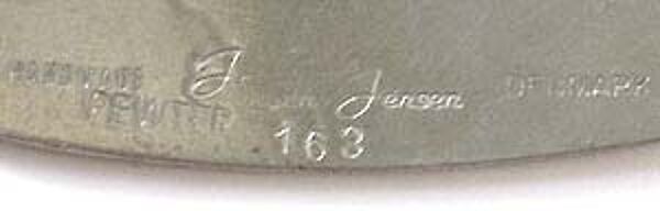 Zu Jörgen Jensen: Sohn von Georg Jensen, studierte 1914 beim Goldschmied Leopold Eberth in München, unterhielt 1923 bis 1936 eine Werkstatt in Stockholm und arbeitete 1936 bis 1962 in der Designabteilung von Georg Jensen in Kopenhagen (Quelle: Katalog zur 6. Auktion des Auktionshauses von Zezschwitz; 05/02).