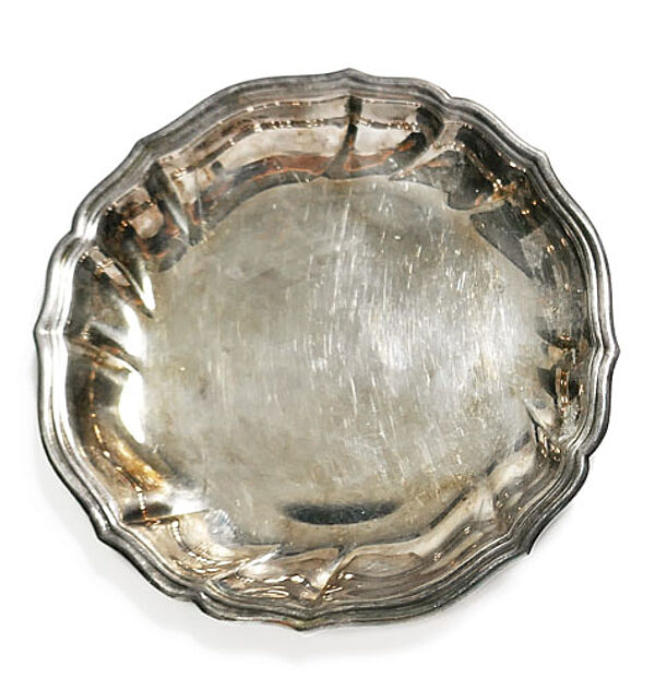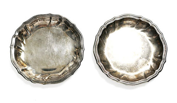 Jeweils flach schalenförmiger Silberkorpus (830er) mit gewelltem, leicht aufgestelltem Randbereich, Durchmesser ca. 8,3 cm, ungeputzter Zustand mit leichten Altersspuren. Wohl 1930er, 40er Jahre.