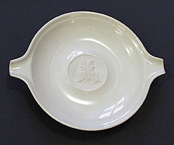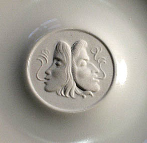 Flach-schalenförmiger, weißer Porzellan-Korpus mit leicht abgesetztem Rand, der für die Zigarrettenablage an zwei gegenüberliegenden Stellen rinnenförmig ausgezogen ist. Im Schalenzentrum befindet sich eine runde, flache Erhöhung, die, medaillonartig, zwei flach reliefierte, nach außen weisende, Rauch ausatmende Gesichter aufweist und - im Gegensatz zum übrigen Ascher - unglasiert ist. Durchmesser ca. 12 cm, Höhe ca. 2,2 cm, geringe Gebrauchsspuren. Unterseitig Markung (nach 1962), Entwurf der Form von Trude Petri (1938), Entwurf der Medaillons von Siegfried Schütz, ebenfalls 1938. Aus dem "Arkadischen Teeservice".