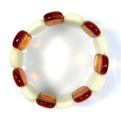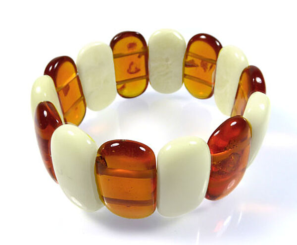 Armband aus kissenförmigen, abwechseln luziden-honigfarbenen und opaken-elfenbeinfarbenen Bernsteinen. Innen verläuft ein doppelter Gummizug. Außendurchmesser ca. 8 cm, Innendurchmesser ca. 6,3 cm, Höhe ca. 3 cm, minimale Tragespuren. Wohl Deutschland der 1940er bis 70er Jahre.