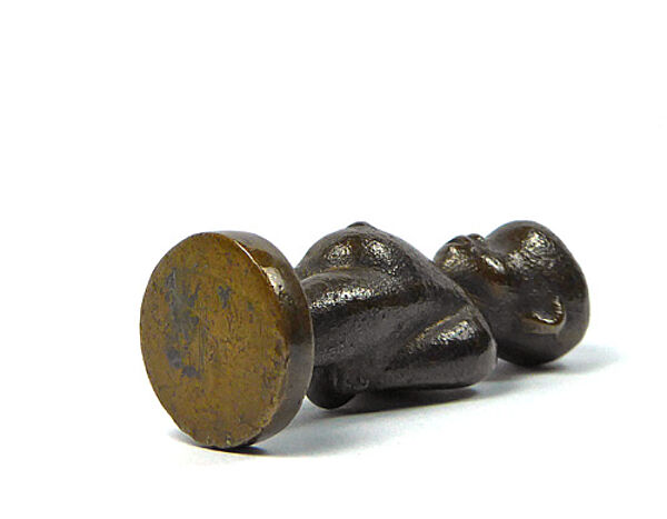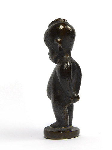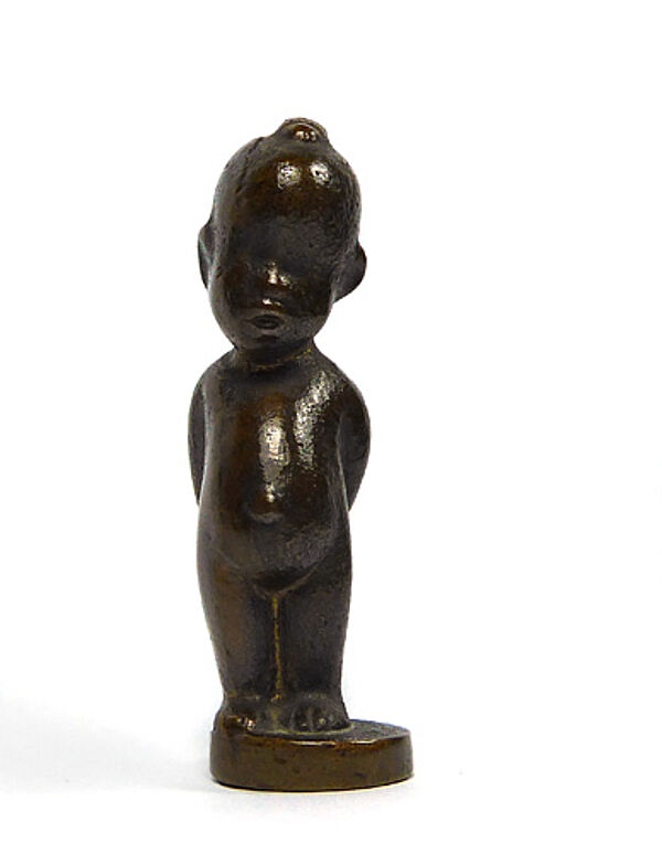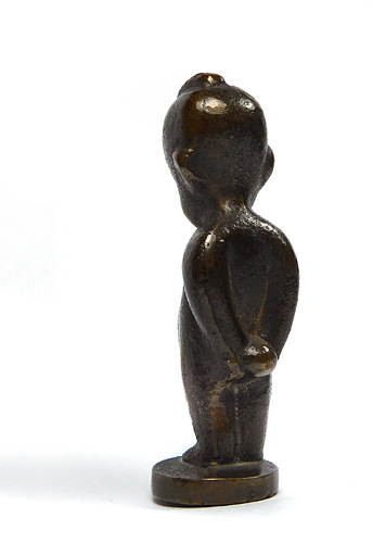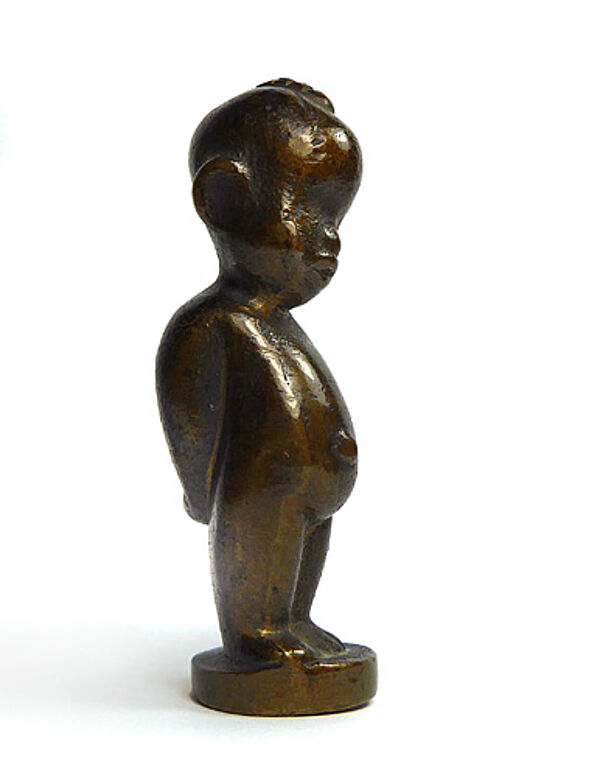 Kleine, leicht stilisierte Bronzeplastik eines afrikanischen Jungen auf scheibenförmigem Fuß. Höhe ca. 7 cm, warme, bräunliche Patina, geringe Altersspuren. Ungemarkt, die Figur ist für Hagenauer belegt, die in den eher frühen 1920er Jahren ausgeführten Stücke waren nicht bezeichnet. Hagenauer hat diese Figuren als "Aschetöter oder Petschaft" angeboten (Zitat WHW-Katalog der 1920er Jahre).
