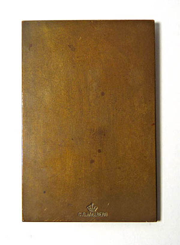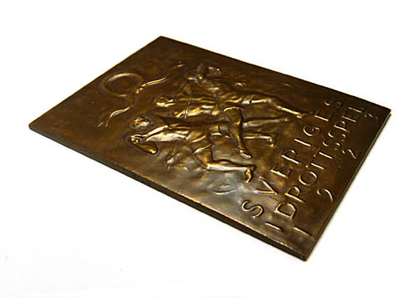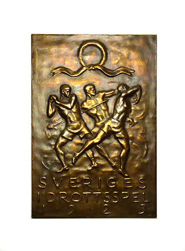Auf der Vorderseite der flach reliefierten, hochrechteckigen Bronzeplakette sind drei werfende, nur mit einer Turnhose bekleidete Männer dargestellt, über ihnen ein Siegerkranz, darunter die Bezeichnung "SVERIGES IDROTTSSPEL 1923". Rückseitig Markung (Krone u. "C.G. HALLBERG"). Maße ca. 6,3 x 4,2 cm, warme Patina mit geringen Griff- bzw. Altersspuren.