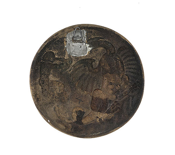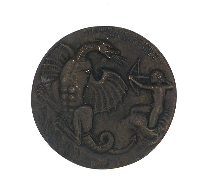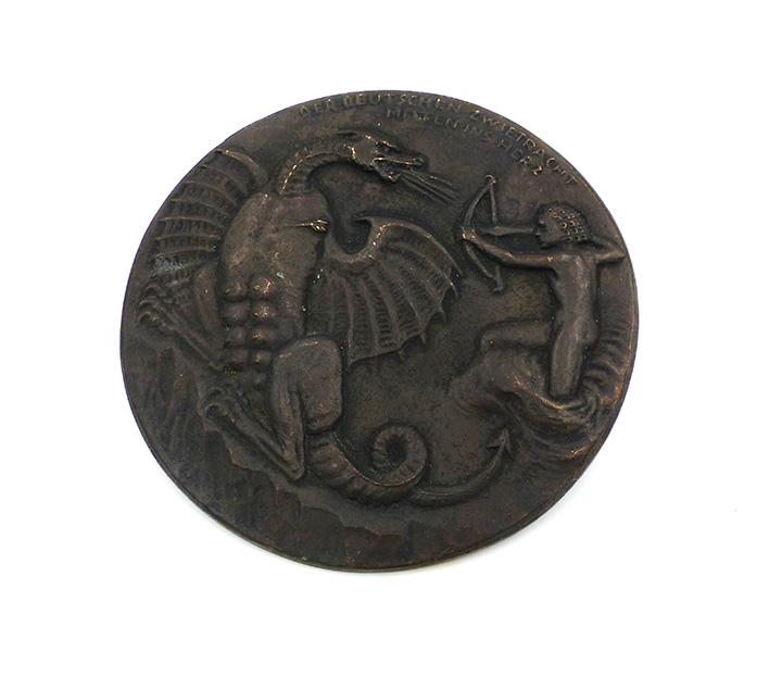 Einseitige, braun patinierte Bronzemedaille mit vorderseitig flach reliefierter, leicht stilisierter Darstellung eines Feuer speienden Drachens, dem gerade ein aus den Wellen steigender nackter Jüngling einen Pfeil ins Herz geschossen hat. Am oberen Randbereich findet sich ein Zitat aus Gerhart Hauptmanns Drama "Florian Geyer" (über die Zeit der Reformation und des Bauernkrieges in Deutschland, veröffentlicht 1896): "Der deutschen Zwietracht mitten ins Herz". Durchmesser knapp 11 cm, geringe Altersspuren. Rückseitig später angelötete Öse zur Aufhängung. Wohl Deutschland der 1920er Jahre.