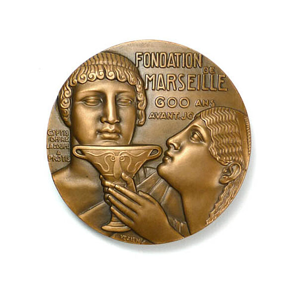 Beidseitig akzentuiert reliefierte Bronzemedaille, vorderseitig im oberen Drittel bezeichnet: "FONDATION DE MARSEILLE - 600 ANS AVANT. JC" sowie seitlich "CYPTIS OFFRE LA COUPE A PROTIS". Dargestellt ist die Legende der Stadtgründung von Marseille, ca. 600 vor Christi: die Tochter Gyptis des keltischen Königs Nann sollte unter allen versammelten jungen Männern demjenigen einen Kelch reichen, den sie zu heiraten wünschte. Überraschenderweise wählt sie Protis, den Anführer seefahrender, neu angekommener Griechen. Die beiden heirateten, und Griechen und Kelten gründeten gemeinsam die Siedlung Massalia (Quelle Wikipedia 09/13). Rückseitig wird die Darstellung von einem großen, rauchenden Dampferschornstein dominiert, rechts, im Hintergrund, erkennt man den alten Hafen von Marseille, darüber die Hügel der Garde-Spitze mit der Basilika Notre-Dame-de-la-Garde (ein Wahrzeichen Marseilles), hier umlaufend bezeichnet: "FOIRE INTERNATIONALE DE MARSEILLE. 1924". Im Randbereich beidseits signiert. Durchmesser ca. 7 cm, geringe Griff- und Altersspuren.