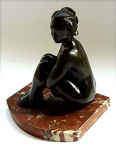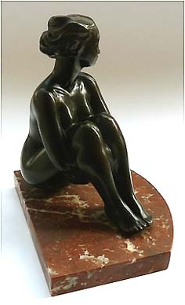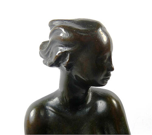 Sitzender, die Hände unter den Beinen fassender, weiblicher Akt aus gleichmäßig-dunkel patinierter Bronze auf rötlich-weiß geäderter Marmorplatte, die vorderseitig konvex abgerundet ist (Verbindung gelockert). Höhe mit Sockel ca. 20 cm, ohne ca. 18 cm. Geringe Griff- und Alterspuren. Unbezeichnet, wohl um 1910 bis 20.