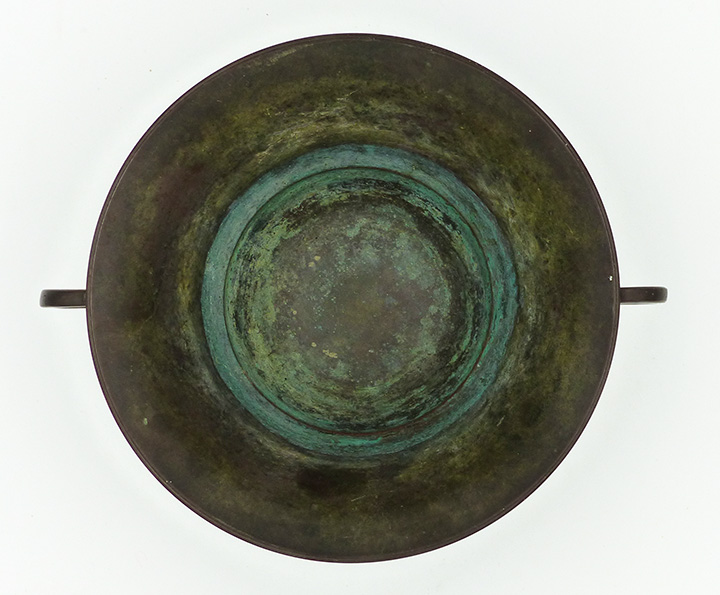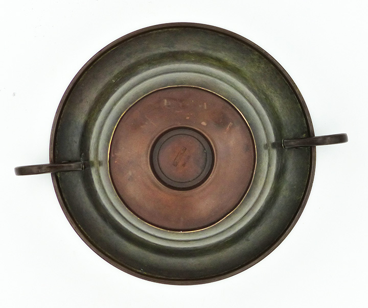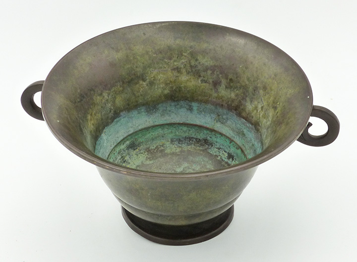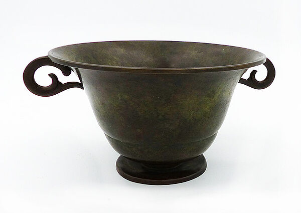 Scheibenförmig gefußter, schalenförmiger, dünnwandiger, grün-braun patinierter Bronzekorpus mit ausgestelltem Rand und zwei leicht verschlungenen Handhaben. Durchmesser ca. 16,5 cm, Höhe ca. 9 cm, Fuß leicht dellig, innenseitig etwas grünspanig, sonst eher geringe Gebrauchsspuren. Unterseitig bezeichnet "Bronce" und "Import", wohl Dänemark der 1920er, 30er Jahre.