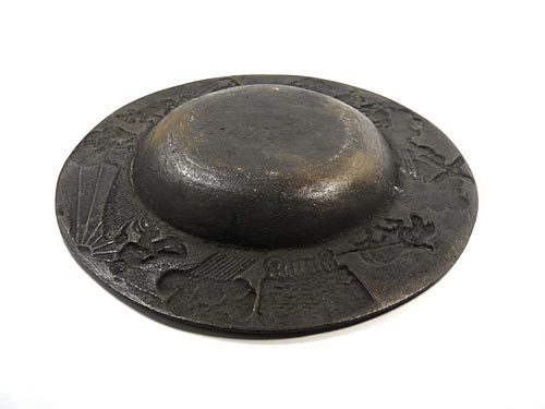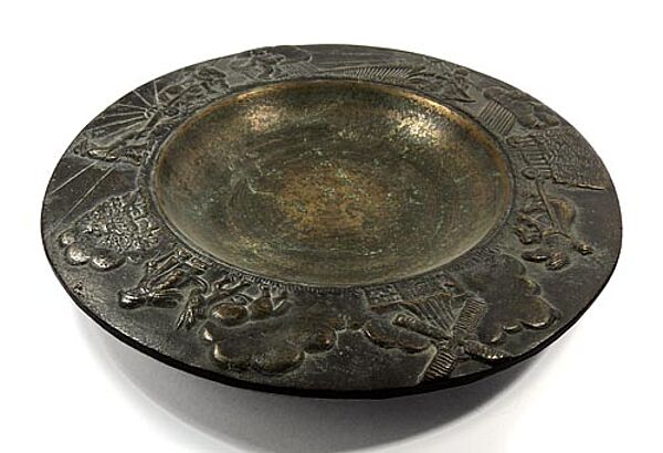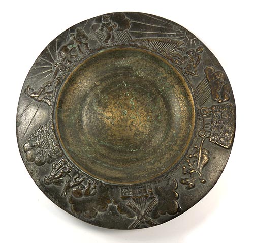 Schalenförmiger Korpus aus Bronze, der breite Rand weist flach reliefierte, etwas naiv wirkende Szenen des bäuerlichen Lebens in den vier Jahreszeiten auf. Durchmesser ca. 28 cm, überwiegend relativ dunkle Patina, geringe bis moderate Gebrauchsspuren. Unbezeichnet, wohl Deutschland oder Nederlande der 20er Jahre.
