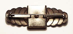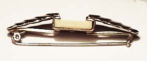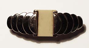 Korpus aus verchromtem Metall mit schuppenartiger Gliederung, zentral rechteckige, elfenbeinfarbene Kunststoffplatte. Länge ca. 4,7 cm, minimale Gebrauchsspuren. Unbezeichnet, evtl. Frankreich der 20er Jahre.