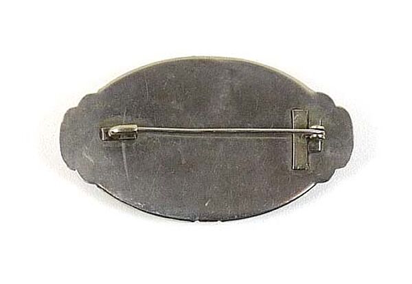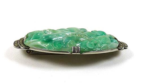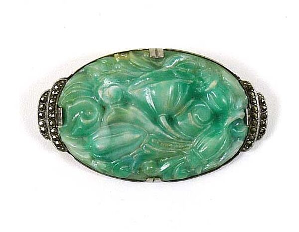 In der Grundform quer-ovaler Korpus aus vernickeltem Metall, vorderseitig ist ein von 4 Krappen gehaltenes, halbplastisch ausgearbeitetes Blüten- und Blätterstück aus Jade-farbenem Kunststoff aufgesetzt. Seitlich befinden sich zwei schmale, mit Markasiten besetzte Stege. Maße ca. 6 x 3,4 cm, geringe Tragespuren. Rückseitig einfache Broschierung. Wohl Frankreich der 20er Jahre.