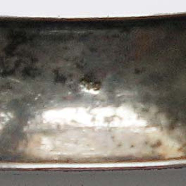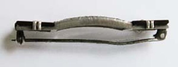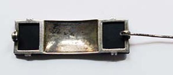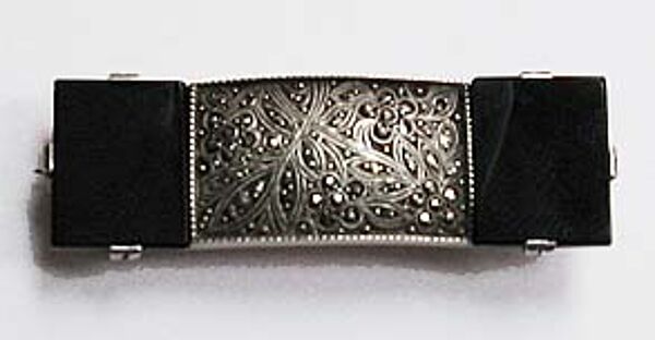 Der bandförmige Silber-Korpus (935er) ist dreigeteilt, wobei der zentrale Anteil eine leichte, konvexe Wölbung sowie ein filigranes, florales Dekor mit eingestreuten Markasiten aufweist, welches von einem feinen Perlrand eingefaßt wird. Die beiden äußeren, planen Anteile tragen jeweils eine rechteckige Onyx-Plate in Krappenfassung. Länge ca. 4,7 cm, ungeputzter Zustand mit diskreten Gebrauchsspuren, so ist die Nadel der Sicherheitsbroschierung (mit Kugelkopf) leicht verboen. Wohl Deutschland der 20er Jahre.
