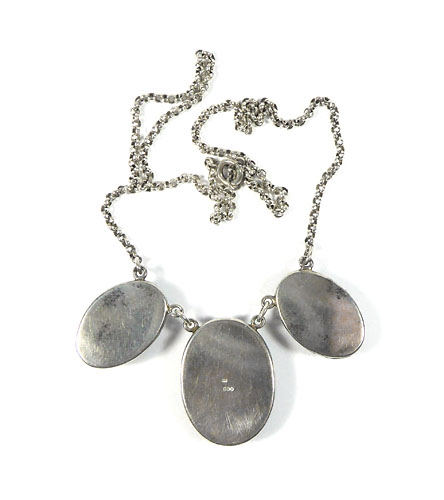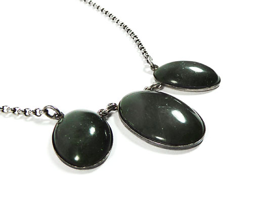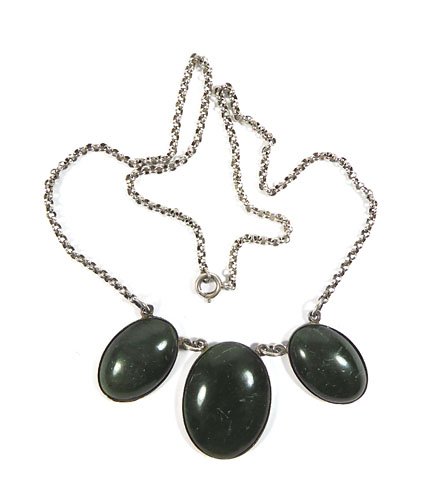 Silbernes Collier (800er), welches mittig drei dunkelgrüne, ovale Schmuckstein-Cabochons (Jaspis? Aventurin? Moosachat? Malachit?) in Zargenfassung integriert, seitlich jeweils feine Erbskette mit Ringösenverschluss. Kettenlänge ca. 45 cm, ungeputzter Zustand mit moderater Patina und geringen Tragespuren. Gemarkt "KB" im Rechteck (attrib. Karl Bayer), wohl Deutschland der 1910er bis 30er Jahre.