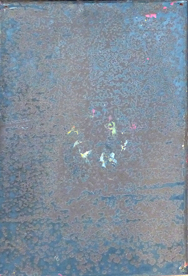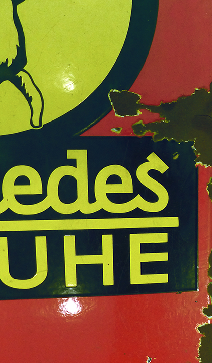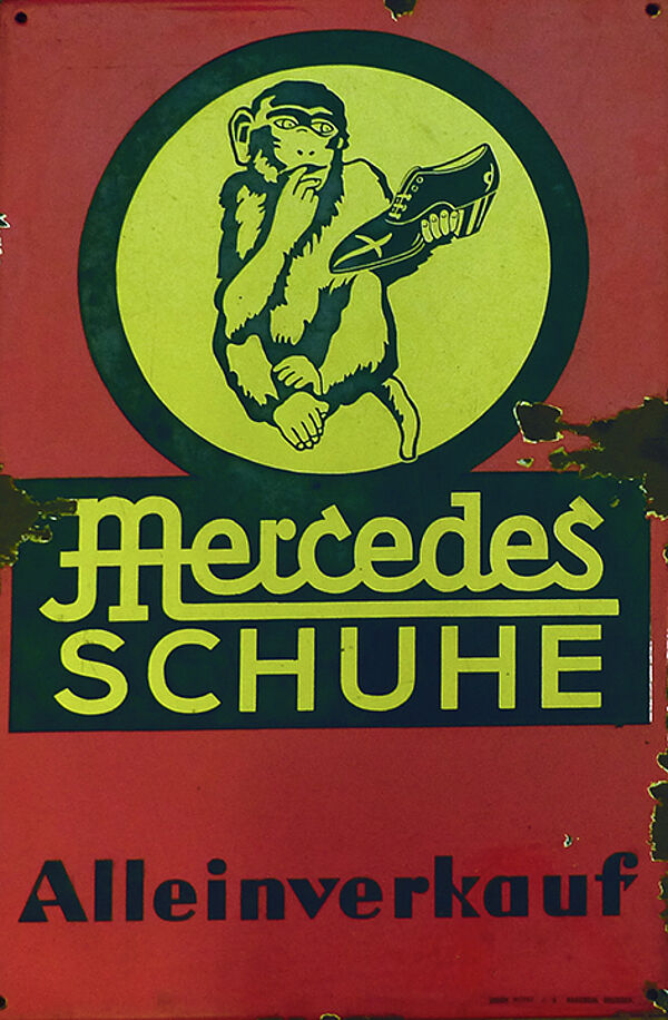 Hochrechteckiges, leicht gewölbtes, schabloniert emailliertes Reklameschild im dunkelweinroten Grundton. In der oberen Hälfte ist in einem schwarzen Kreis, gelb hinterlegt, ein sitzender Affe abgebildet, der einen Herrenschuh in der linken Hand hält, die rechte Hand führt er bewundernd zum Mund. Mittig verläuft ein gelber, schwarz hinterlegter Schriftzug "Mercedes SCHUHE", oberhalb des unteren Randes findet sich die Bezeichnung "Alleinverkauf". Rechts unten Herstellerbezeichnung: "Union-Werke A.G. Radebeul-Dresden". In den vier Ecken befindet sich jeweils ein Loch zur Anbringung des Schildes. Höhe ca. 69 cm, Breite ca. 44 cm. Es zeigen sich rechts deutlicher links im Bereich des jeweils mittigen Randes Emailleverluste, siehe Foto, die das Motiv aber kaum tangieren, ansonsten moderate Altersspuren, so rückseitig rostig. Wohl 1930er Jahre.