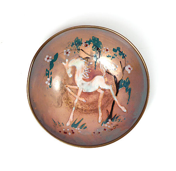 Schalenförmiger Kupferkorpus, oberseitig leicht stilisierte Emaillemalerei eines springenden weißen Pferdes, im Hintergrund ein blühender Baum.
