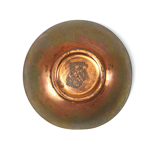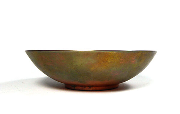 Durchmesser ca. 11 cm, Höhe ca. 3,2 cm, ungeputzter Zustand mit leichter Patina mit geringen Alters- und Gebrauchsspuren. Unterseitig gemarkt, wohl 1940er bis 60er Jahre.