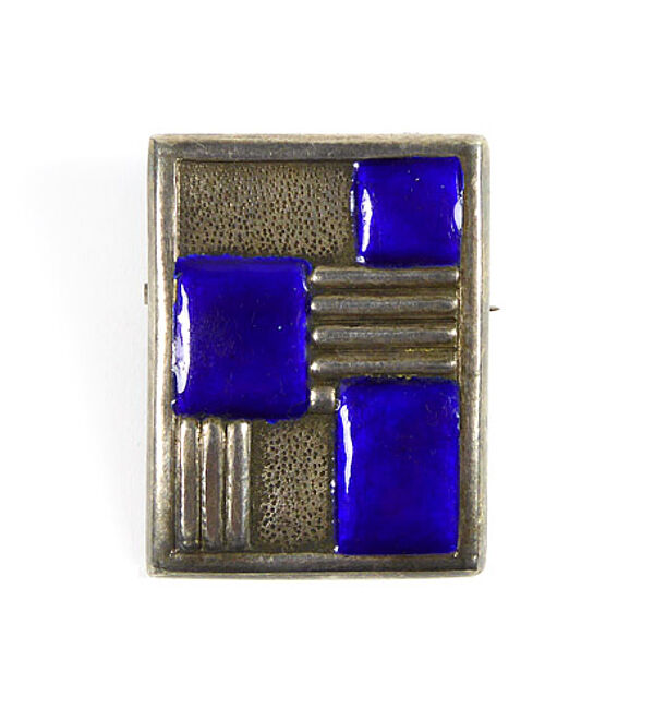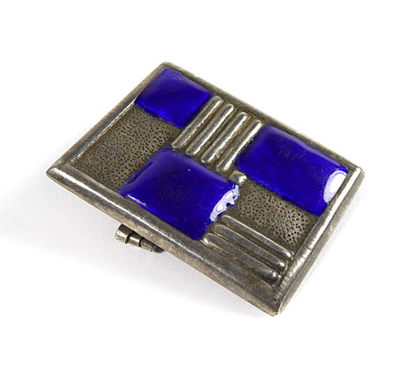 Rechteckiger Silberkorpus (geprüft) der eine geometrische Gliederung der Vorderseite, hier zeigen sich drei leuchtend blaue, zwei fein punzierte und zwei stegförmig reliefierte, jeweils rechteckige Felder. Maße ca. 4,1 x 3,1 cm, ungeputzter Zustand mit moderater Patina und leichten Tragespuren. Rückseitig einfache Broschierung. Ungemarkt, wohl Deutschland der 1910er oder 20er Jahre.