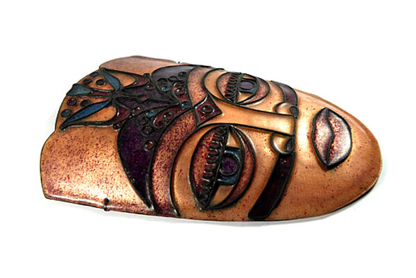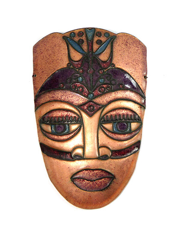 Flach konvex gewölbtes Kupferblech. Vorderseitig farbiges Steg-Emaille: stilisierte Darstellung eines weiblichen Gesichtes mit Stirnschmuck. Seitlich befinden sich zwei kleine Löcher zur Montage. Maße ca. 23 x 16 cm, geringe Altersspuren. Unbezeichnet, stilistisch aber mit hoher Wahrscheinlichkeit Janos Percz (Ungarn) zuzuordnen, wohl 1960er, 70er Jahre.