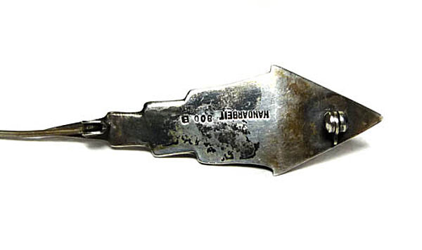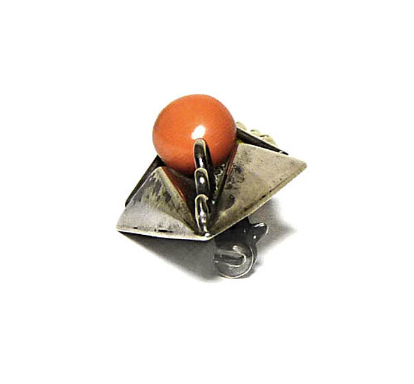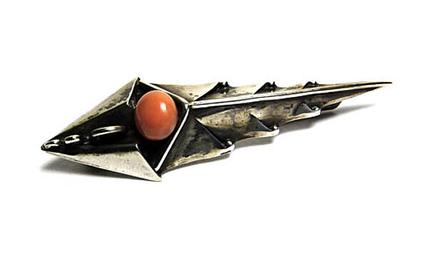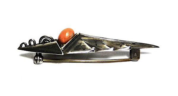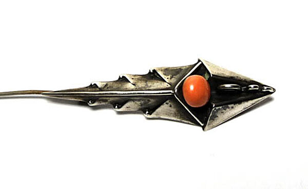 Handgefertigter, hohl gebödeter, plastischer Silberkorpus (900er) in Form eines asymmetrischen, stacheligen Blattes mit integrierter, lachsroter Korallenperle. Länge ca. 6,1 cm, Breite ca. 1,8 cm, ungeputzter Zustand mit teilweise dunkler Alterspatina und geringen Tragespuren. Rückseitig ungedeutete Markung und Sicherheitsbroschierung mit Kugelkopf. Wohl Deutschland der 1920er Jahre.