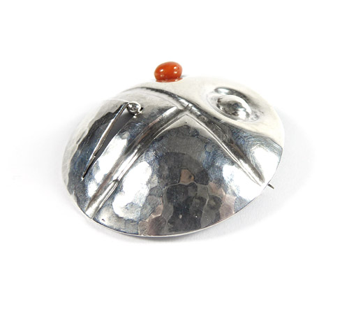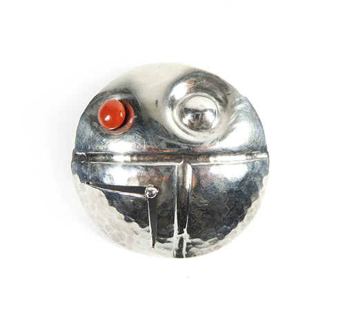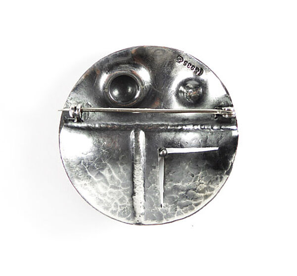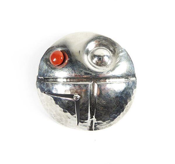 Handgetriebener, in der Grundform runder, deutlich gewölbter Silberkorpus (935er) mit im unteren Anteil martellierter Oberfläche. Mittig bzw. in der unteren Hälfte T-förmig angelegte, schmale Vertiefungen, im linken unteren Quadranten zeigt sich eine rechtwinklige Schlitzung, an deren Scheitelpunkt eine kleine Kugel fixiert ist, im rechten oberen Viertel kann man eine rundliche Vertiefung mit zentraler Wölbung und im linken oberen Quadranten eine leichte Vertiefung ausmachen, in der eine linsenförmige Korallenperle montiert ist. Durchmesser ca. 4,1 cm, ungeputzter Zustand mit diskreter Patina und leichten Tragespuren. Rückseitig Markung und Sicherheitsverschluss mit Kugelkopf. Wohl 1920er Jahre.