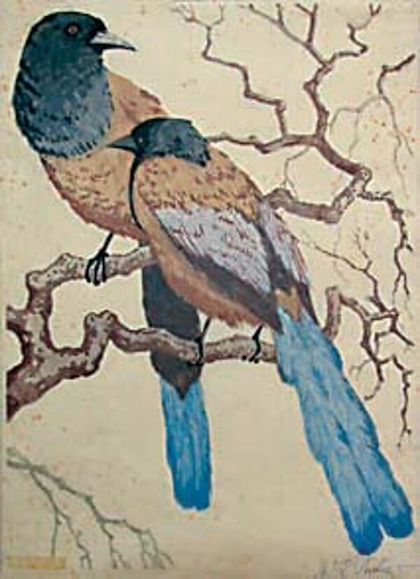 Farbholzschnitt: Wanderelstern