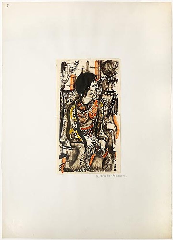 Farbige Tuschezeichnung, ausgeführt mit Pinsel und Feder, auf dünnem Papier mit den Maßen von ca. 20,8 x 11,2 cm, dieses ist montiert auf etwas kräftigeres Papier mit den Maßen von ca. 43 x 30,6 cm. Das Blatt selbst ist relativ frisch, die Unterlage ist etwas griffspurig. Rechts unten monogrammiert. Wohl 20er, 30er Jahre.