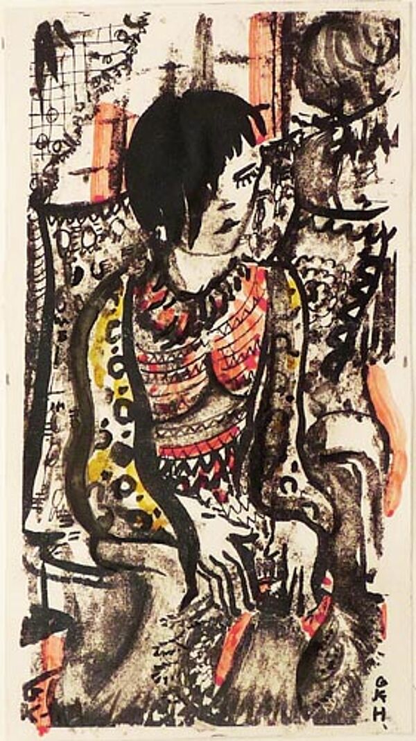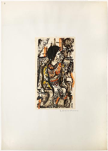 Farbige Tuschezeichnung: ohne Titel (sitzende junge Frau)