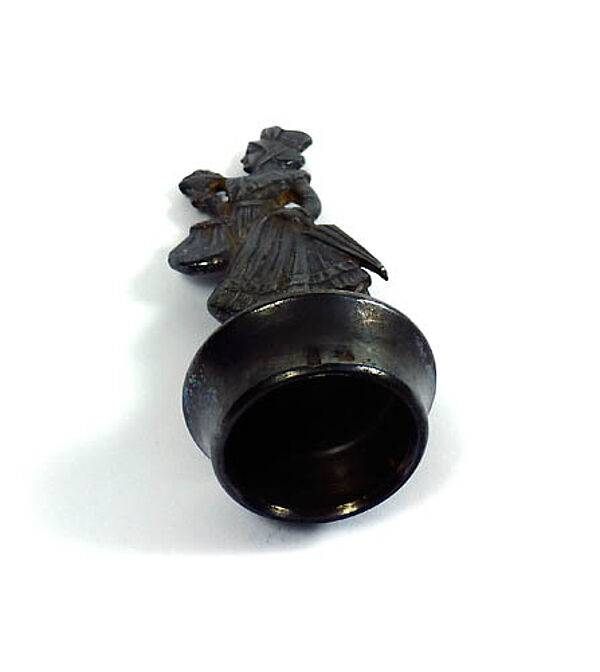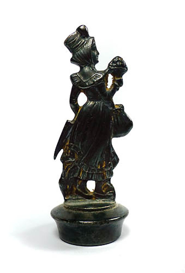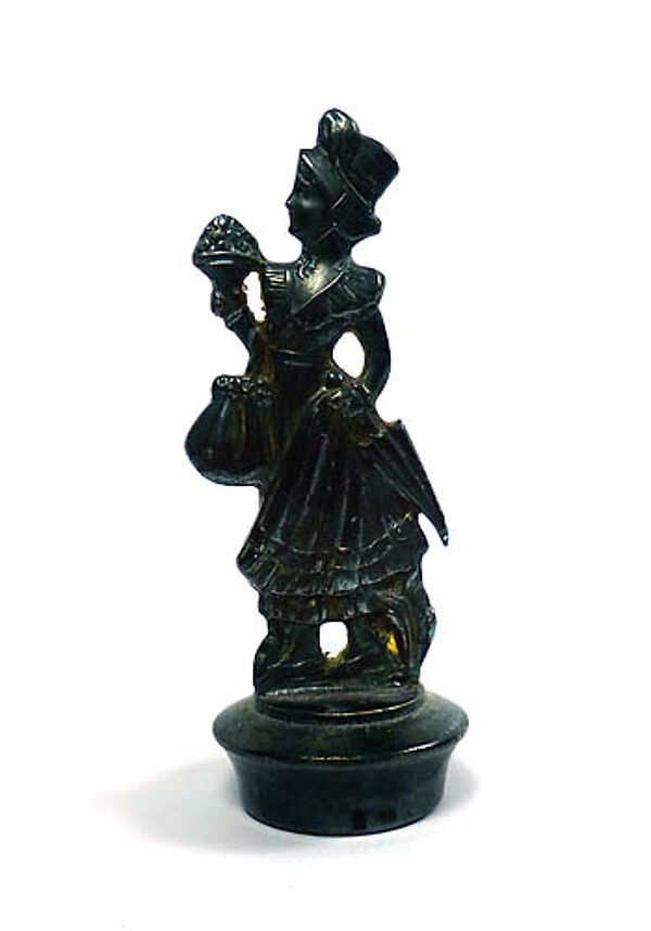 Halbplastischer, versilberter Metallkorpus in Form einer biedermeierlichen, jungen Frau mit Blumenstrauß, Tasche und Schirm. Höhe ca. 7,8 cm, Innendurchmesser für den Korken ca. 2 cm, fast gleichmäßige, dunkle Patina, geringe bis moderate Alters- und Gebrauchsspuren. Markung (.....), wohl um 1915 bis 25.