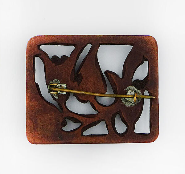 Handgeschnitzter, dunkelbraun gefasster, offen gearbeiteter, halbplastisch angelegter Holzkorpus. Stilisiert dargestellt sind zwei Enzianblüten mit Blattwerk, umschlossen von einem querrechteckigen Rahmen mit abgerundeten Ecken. Maße ca. 3,5 x 4,5 cm, geringe Tragespuren. Rückseitig einfache Broschierung. Wohl Alpenraum, also Deutschland oder Österreich oder Schweiz der 1910er bis 30er Jahre (stilistisch "zwischen Jugendstil und Art deco").