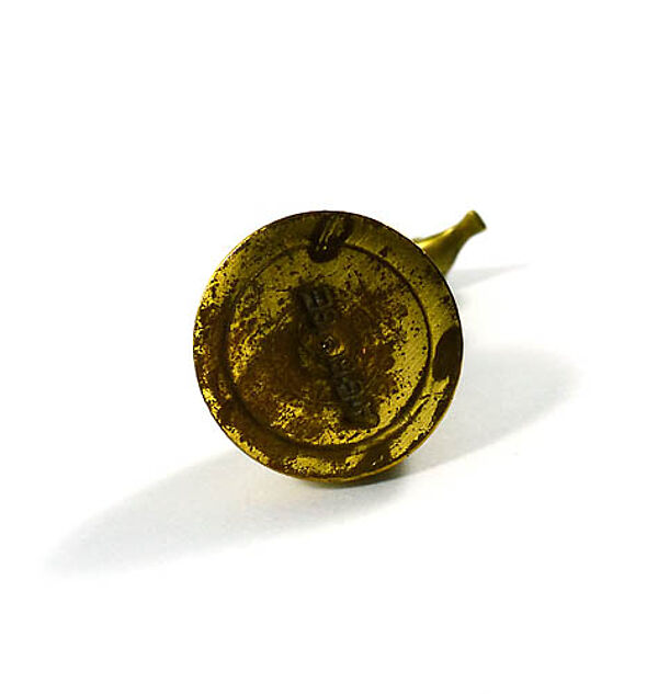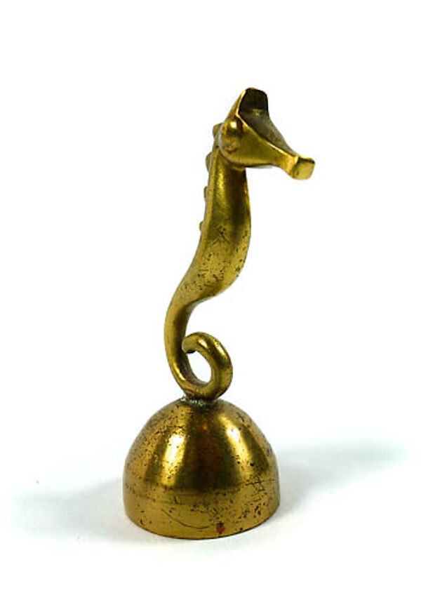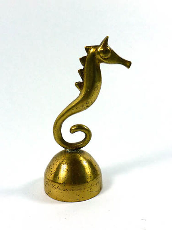 Vollplastischer Messingkorpus in Form eines stilisierten Seepferdchens. Höhe ca. 5 cm, moderate Patine, geringe Alters- und Gebrauchsspuren.Unterseitig gemarkt, wohl um 1920/25.