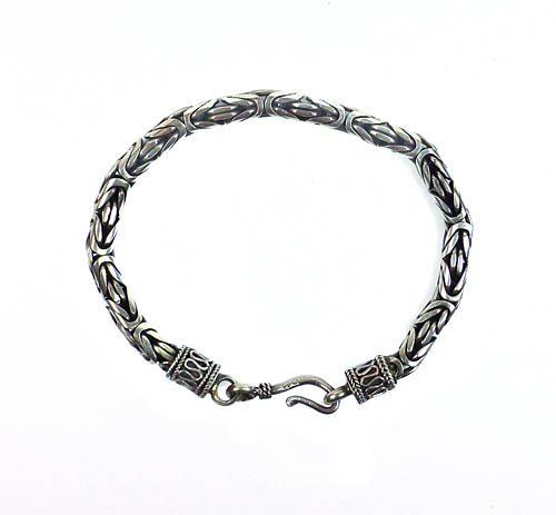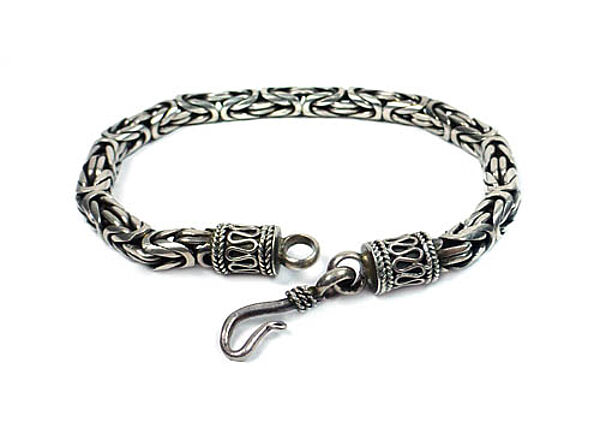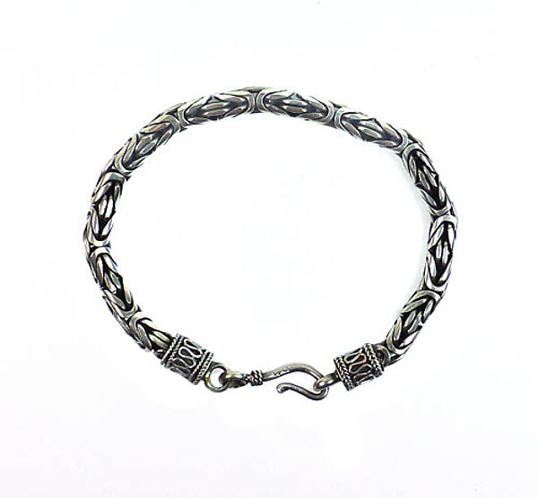 Silberner Korpus (935er) mit komplexer Gliederanordnung, sogenannte Königskette mit rundem Querschnitt, einfacher Hakenverschluss. Länge mit Haken und Öse ca. 19,5 cm, geringe Tragespuren. Evtl. 1940er, 50er Jahre?