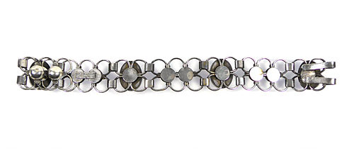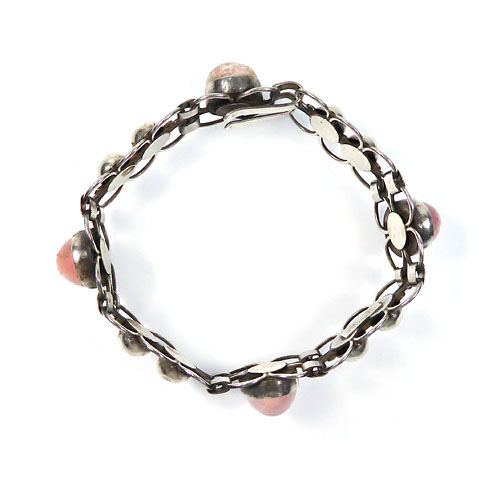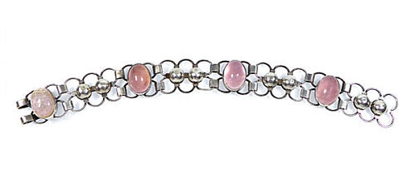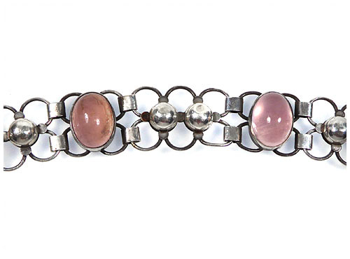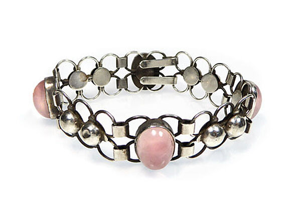 Silbener Korpus (925er) aus geometrischen Gliedern, der vier ovale Rosenquarz-Cabochons in Zargenfassung integriert. Hakenverschluss. Länge ca. 20 cm, Breite ca. 2 cm, ungeputzter Zustand mit geringer Patina und leichten Tragespuren. Innenseitig gemarkt und bezeichnet "Handarbeit". Entwurf wohl 1930er Jahre.