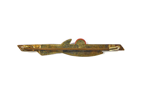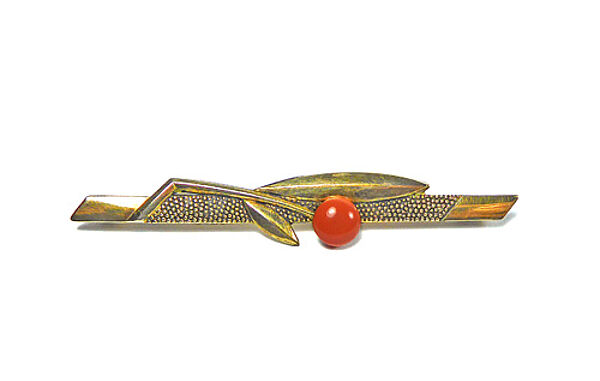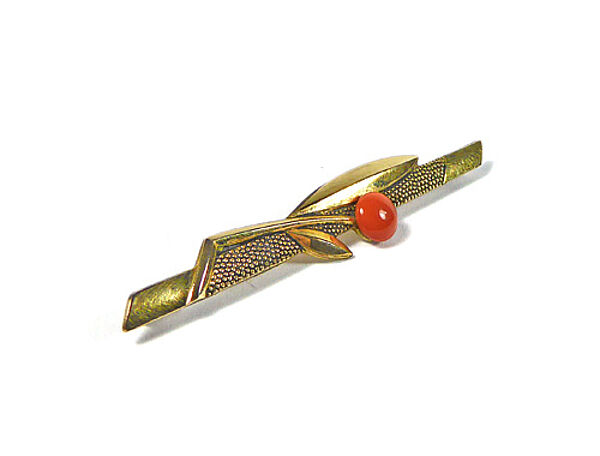 Annähernd bandförmiger Korpus aus Golddoublé in Form eines stiliserten, flach reliefierten Zweiges: zwei abstrahierte Blätter sind zu erkennen, eine lachsrote Korallenlinse symbolisiert eine Blüte. Länge ca. 5,5 cm, ungeputzter Zustand mit leichter Patina und geringen Tragespuren. Rückseitig einfache Broschierung. Ungemarkt, wohl Deutschland der 1920er Jahre.