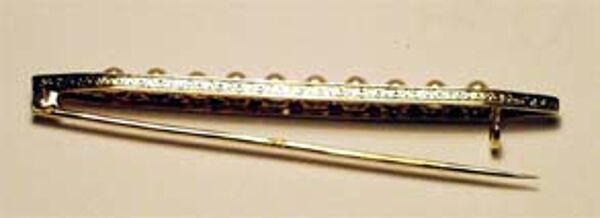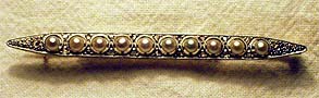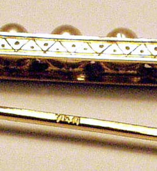 Langer, spindelförmiger Korpus aus Gelbgold (750er, Stempel an der Nadel), der teilweise mit Platin bzw. Weissgold kaschiert und mit einer Reihe aus 10 Zuchtperlen besetzt ist. Um diese sind 20 kleine Brillianten angeordnet. Länge ca. 5,7 cm. Minimale Tragespuren. Wohl Deutschland der 20er, 30er Jahre.