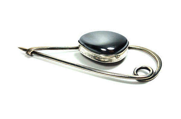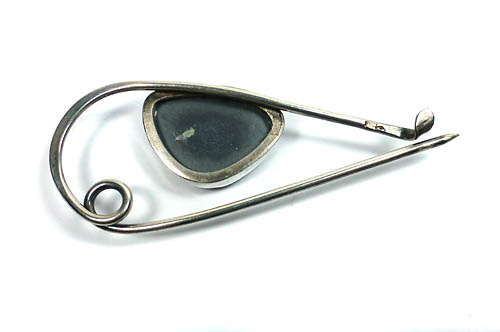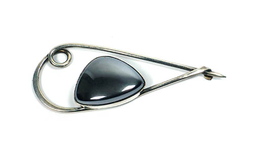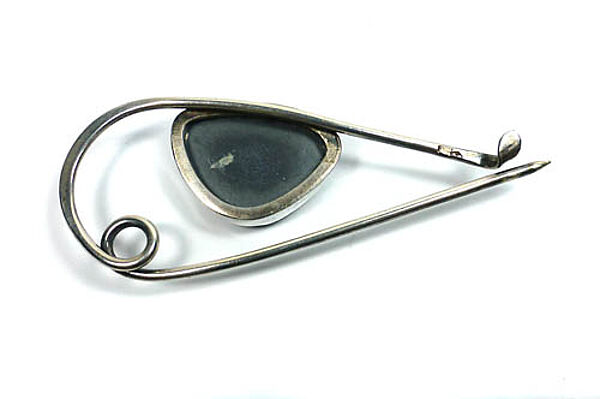 Puristischer, spindelförmig gebogener Korpus aus kräftigem Silberdraht (925er), der einen annähernd dreieckig konfigurierten Hämatit-Cabochon in Zargenfassung trägt. gemarkt, mit gefasstem Hämatit-Cabochon. Länge der Brosche ca. 7 cm, Maße des Steins ca. 2,5 x 1,6 cm. Ungedeutete Markung, wohl 1930er bis 50er Jahre.