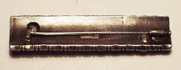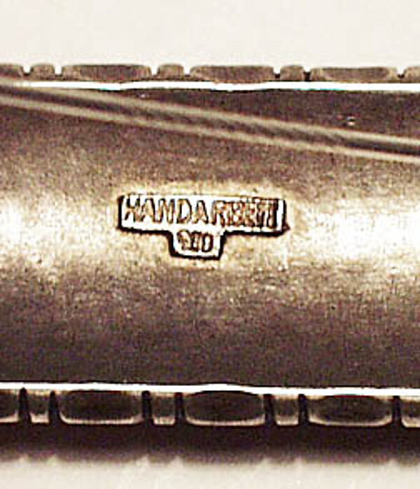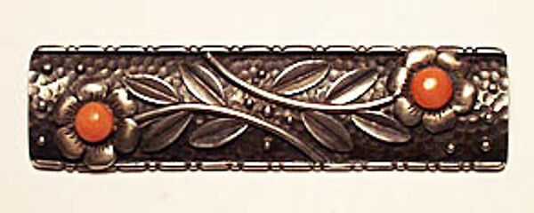 Länglich-rechteckiger, gewölbter Silber-Korpus (900er), der vorderseitig ein stilisiertes, plastisches Blumendekor auf martellierter Oberfläche zeigt, eingearbeitet sind zwei Korallen-Cabochons. Länge ca. 7 cm. Dunkle Patina, ungeputzter Zustand. Rückseitig einfache Sicherheitsbroschierung mit Schiebekopf sowie Bezeichnung "Handarbeit". Wohl deutsche oder Wiener Arbeit der 1920er, 30er Jahre.