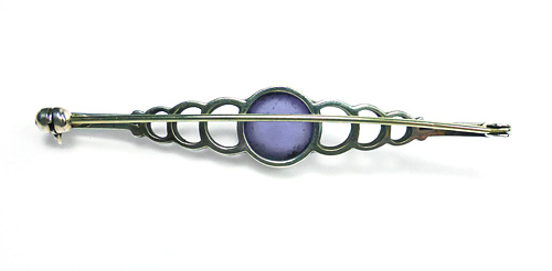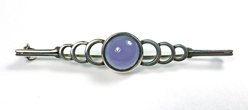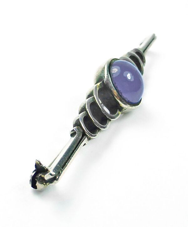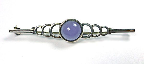 Handgearbeiteter, symmetrisch augebauter Silberkorpus (935er), der mittig einen runden Chalcedon-Cabochon in Zargenfassung integriert. Jeweils seitlich schließen drei Ringelemente im Verlauf an, die zum Ende hin in einen kleinen Steg übergehen. Länge ca. 6,5 cm, ungeputzter Zustand mit leichter Patina und geringen Tragespuren. Rückseitig Sicherheitsbroschierung mit Kugelkopf. Ungemarkt, wohl Deutschland der 1920er, 30er Jahre.
