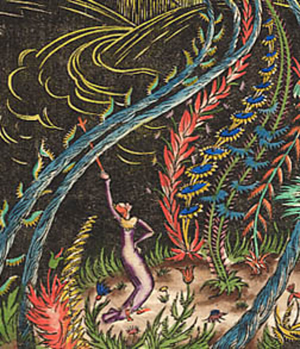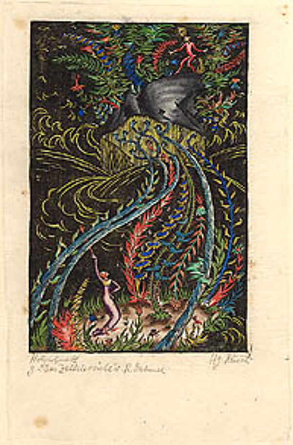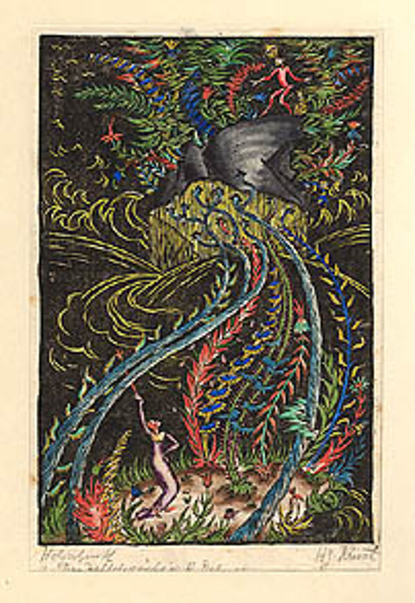 Handkolorierter Holzschnitt: Das Zettelevariete, Illustration zu Richard Dehmel