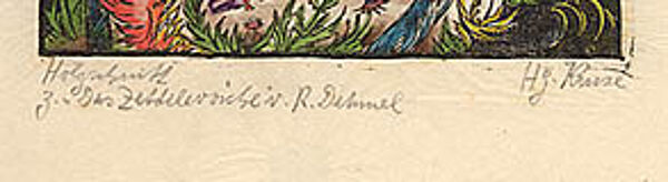 Handkolorierter Holzschnitt auf dünnem, chamoisefarbenem Papier, unter Passepartout montiert. Bildmaße ca. 20,5 x 13,6 cm, Blattmaße ca. 27,1 x 17,8 cm., Außenmaße der antiken, vergoldeten und leicht verzierten Holzleiste 45 x 35 cm. Außerhalb der Darstellung etwas braunfleckig, teilweise an den Kanten kleine Falten. Handsigniert und unten bezeichnet: "Das Zettelevariete v. R. Dehmel". Wohl 20er Jahre. Lit.: Vollmer.