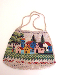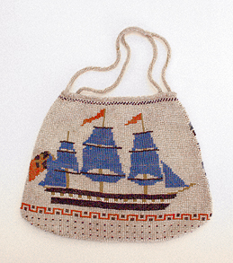 Tasche mit Perlenstickerei: Architektur- bzw. Schiffmotiv. Maße (ohne Henkel) ca. 15 x 15 cm; bis auf wenige fehlende Perlen am Henkel (siehe Foto) geringe Tragespuren. Vermutlich Wien um 1920.