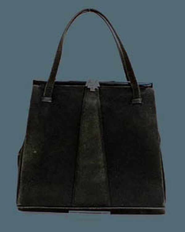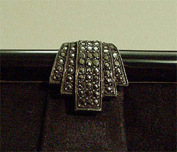 Tasche aus Wildleder, Markasiten-besetzte Schließe, mit schwarzem Kunststoff verblendeter Metallbügel; ca. 17 x 19,5cm. Leder z.T. leicht fleckig und etwas abgegriffen, insgesamt aber annehmbarer bzw. altersgerechter Zustand. Wohl um 1920 / 25.